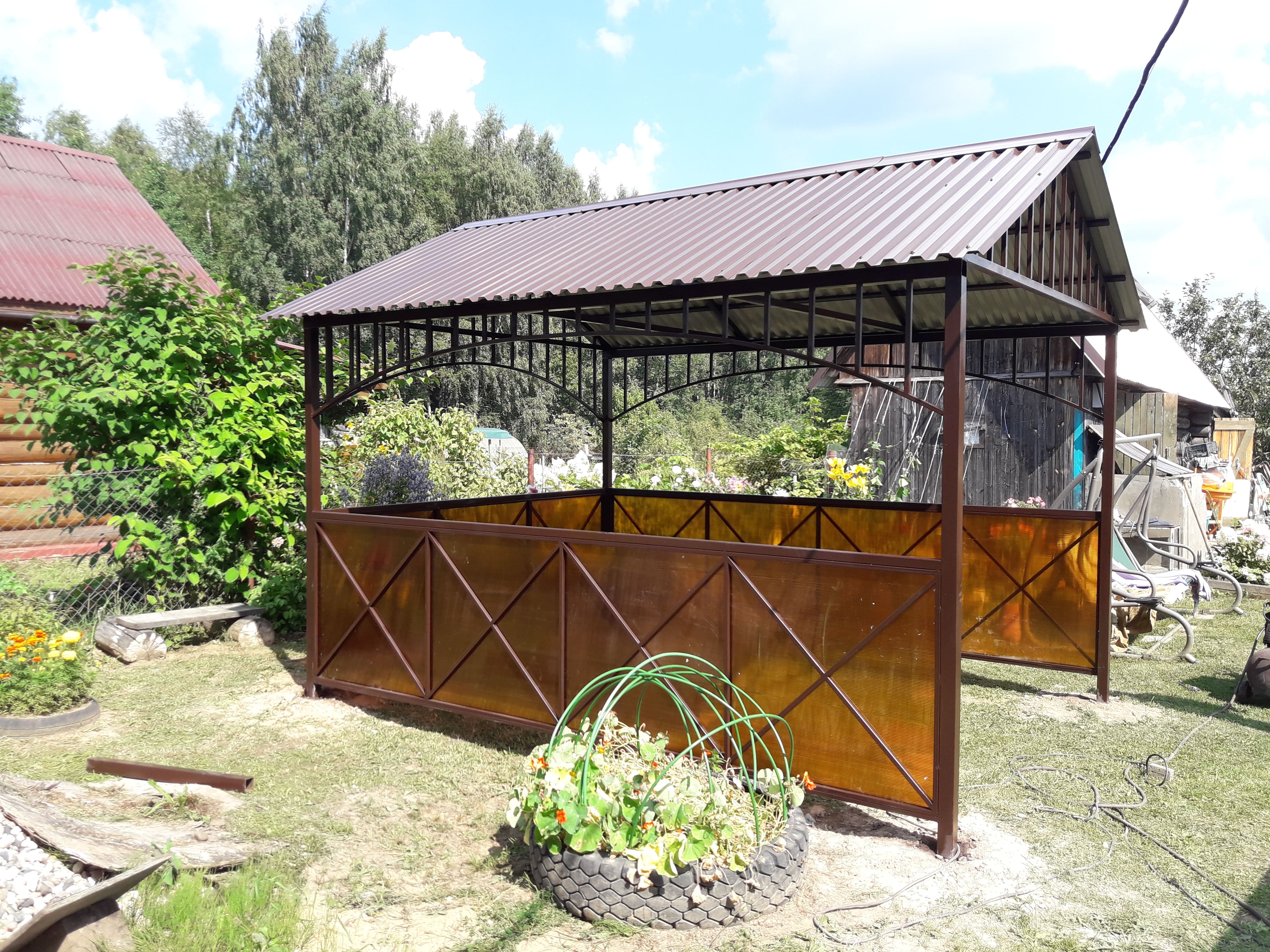 За день на даче изготовили арочный навес 5 на 7 с покрытием поликарбоната. Привезли уже готовые крашенные фермы и весь остальной материал. Все за собой убрали и увезли мусор. Молодцы!